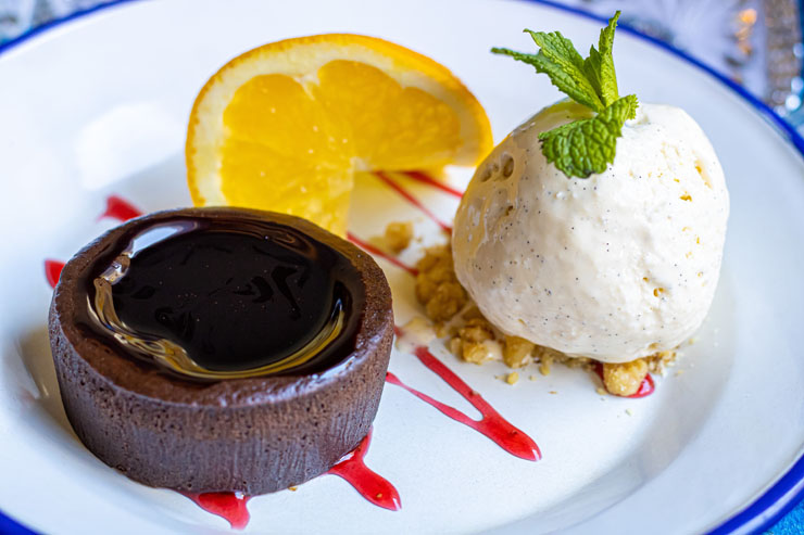 Melted chocolate pudding cake • scoop of vanilla ice cream • nuts