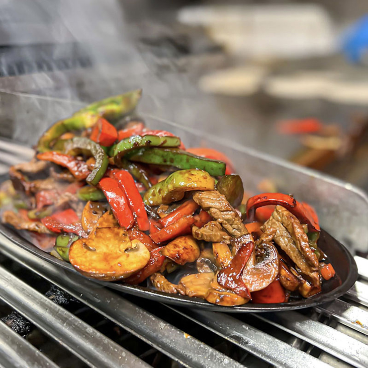 Choice of meat from below served with onions, peppers, mushrooms, and 8 flour tortillas • Sour cream on the side Meat choices: Grilled Beef, Chicken, Mixta (Beef & Chicken)