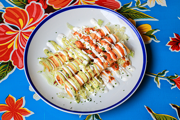 Corn tortillas (3) fried and filled with shredded chicken • lettuce • feta cheese • sour cream • tomato salsa • creamy avocado and salsa verde sauce