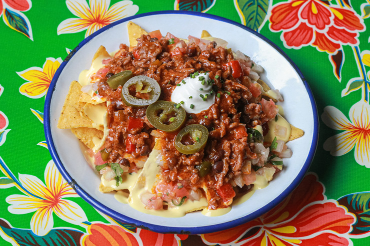 Chilli con carne • corn tortilla chips • rosa negra three cheese sauce • refried beans • pico de gallo • sour cream • with or without jalapeños